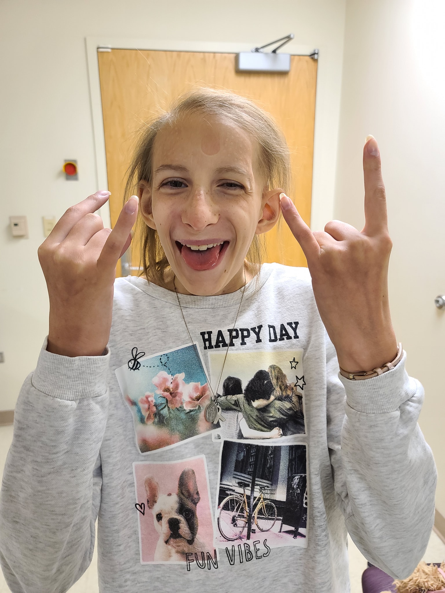 In August 2018, shortly before she started 8th grade, we noticed that Danjela wasn’t feeling “right”. Dr. Mulcahy-Levy asked us to come in for an unscheduled MRI after which we were told that the tumor had grown back and Danjela had officially relapsed. Two weeks before the first day of school, Danjela underwent another tumor resection with Dr. Hankinson. The pathology officially confirmed a relapse and Dani started a clinical trial with Dr. Lindsey Hoffman. We were so hopeful for this new treatment plan, but unfortunately, Danjela was unable to complete the treatment. In October 2018, shortly after starting the trial, Danjela had a series of seizures that left her partially paralyzed and weak on her right side. We were eventually told that she was diagnosed with SMART Syndrome, a rare late-term side effect of targeted radiation. It mimics a stroke but is self-resolving. She spent 3 months in the hospital and by the time she was discharged, she was able to walk and use her right hand & arm.