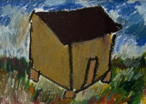 By the mid-1980s, Buchanan turned her attention to Southern vernacular architecture, creating sculptural “shacks” inspired by improvised rural homes in Georgia. Many were accompanied by handwritten or typed “legends,” blending memory and imagination through narrative voices. Her later work drew deeply from nature, folk art, and personal experience, including vibrant oil pastel florals and small assemblages inspired by gardening and local self-taught artists.