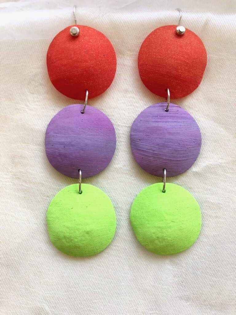 Hand-painted on heat-malleable polystyrene, hand-formed, Sterling silver ear wires, 3.5” long