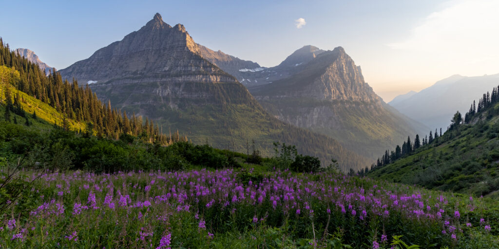 Blooming fireweed at sunset along the Going-to-the-Sun Road in Glacier National Park. Photography on Metal, 16″ x 31″.