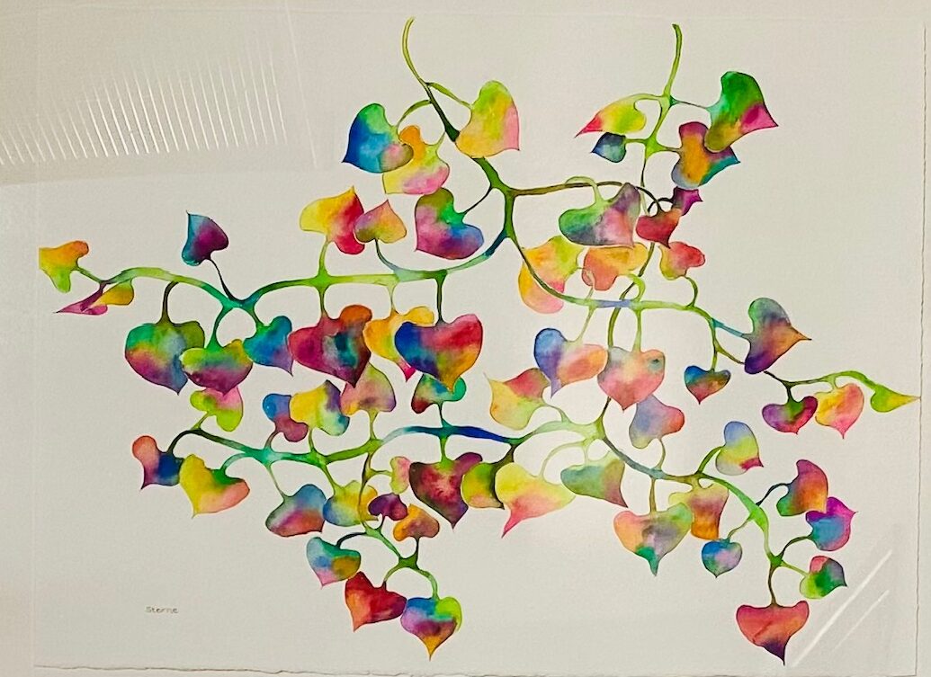 Colorful abstract painting of aspen branch with leaves. Watercolor, 30.5″ high x 37.5″ wide.