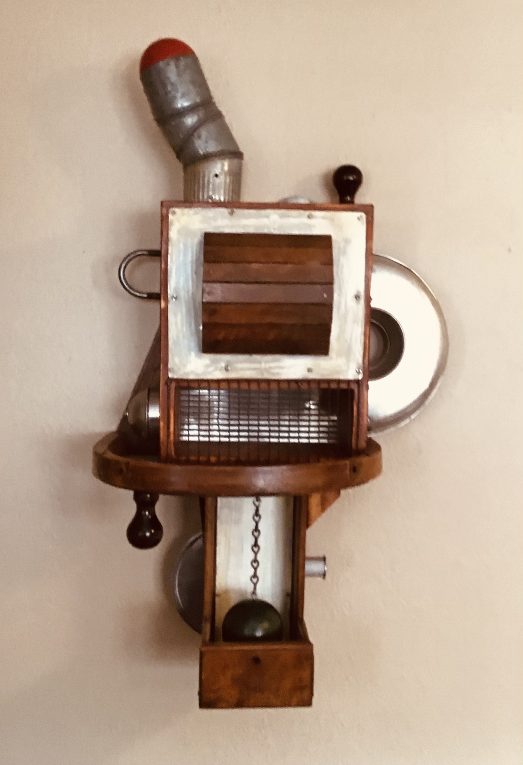Wall hung assemblage Sculpture, 32”H X 18” W X 11” D