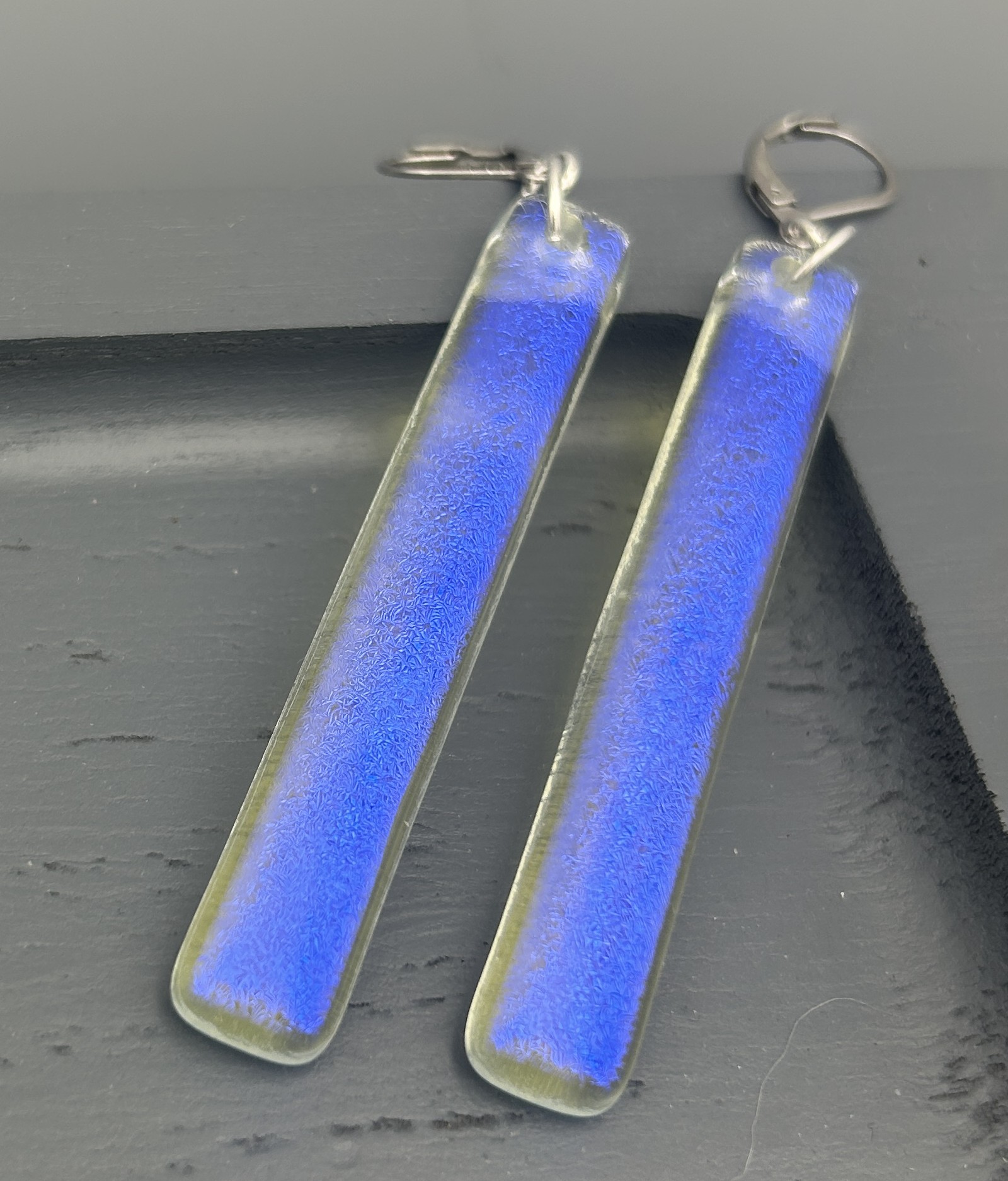 Clear-Blue Glass Earrings with stainless steel ear wire 2.5″ long x 3/8″ wide
