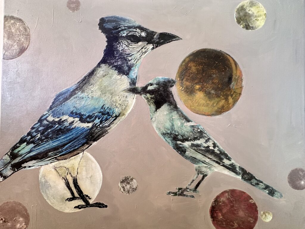 Throughout human history have been thought to be messengers between earth and other realms. This painting depicts two jays in between world patiently waiting for their next assignment. Acrylic on canvas with paper transfers, 30 x 24.