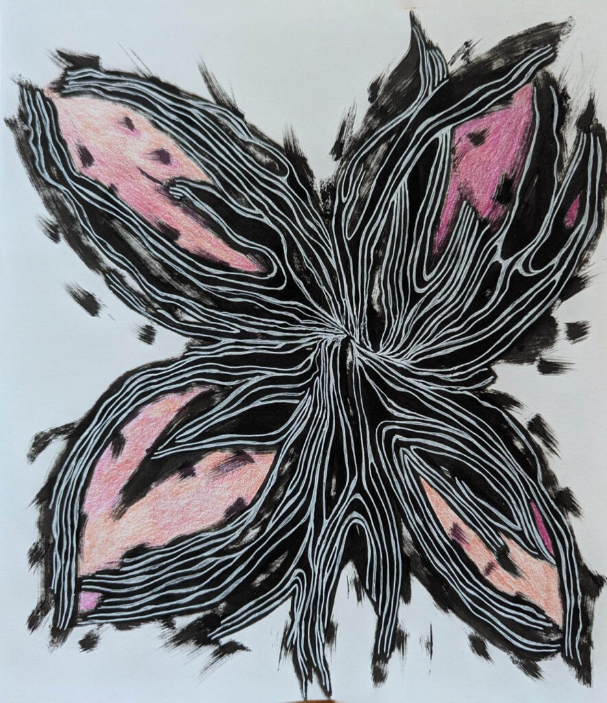 Part of the Abstract Botanica series, inspired by floral life stages and seasonal changes. Acrylic ink and colored pencil on cold pressed paper 10.75 x 10.75 inches.