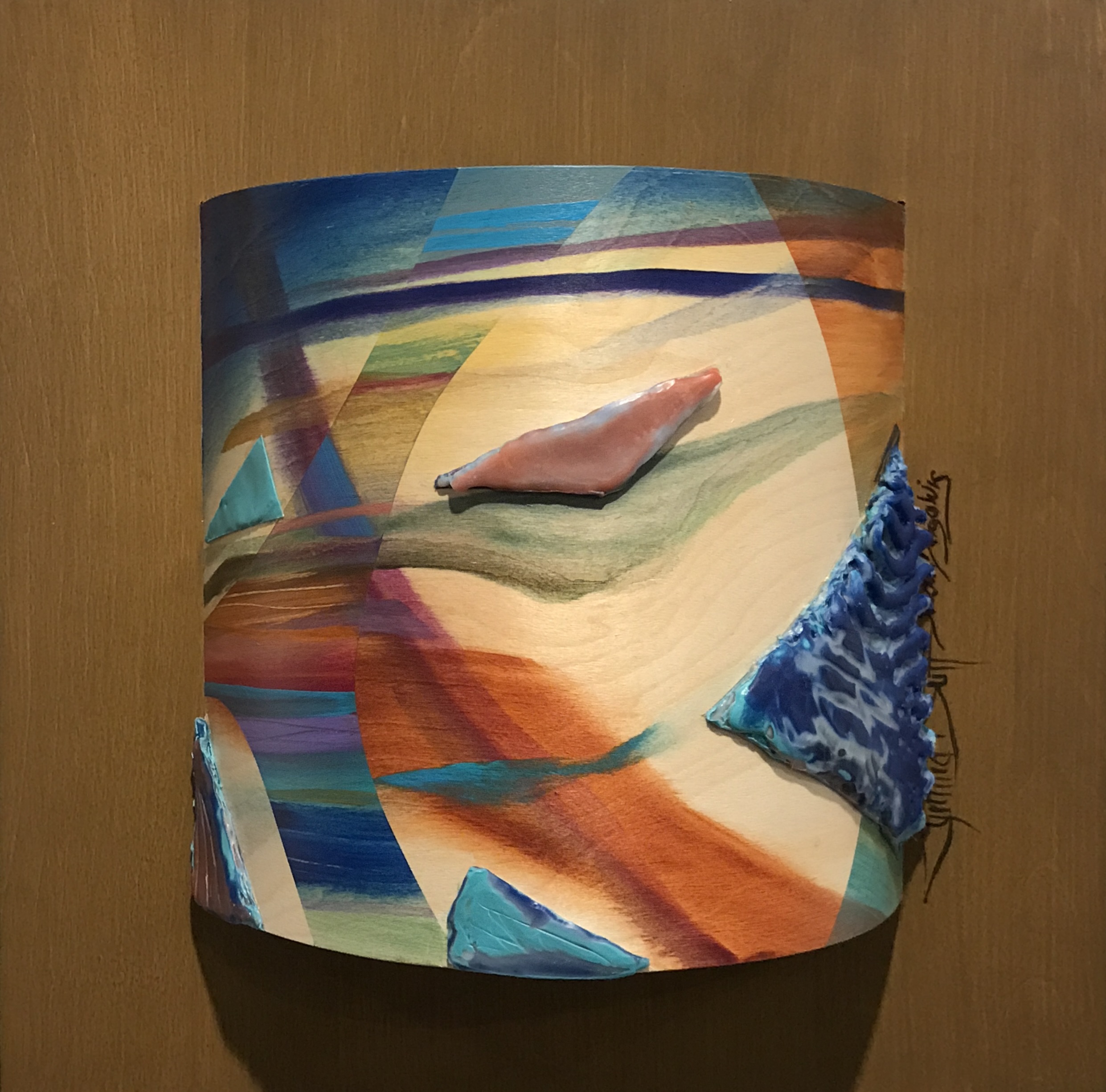 Contemporary Designs on Bent Birch wood. A collaboration which was painted in Acrylic by Cynthia Duff and Encaustic Wax by Susan Delgavis. Acrylic and Encaustic Wax on Bent Birch Wood, 16″ x 16″ x 4″.