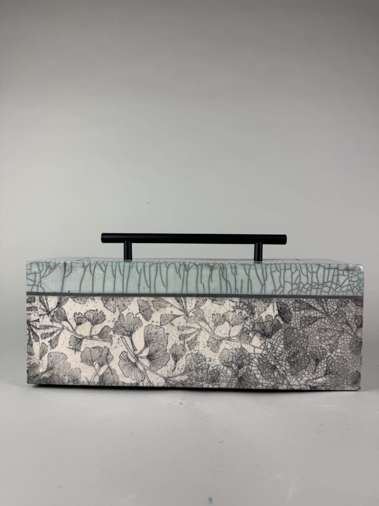 Raku fired celadon clay box, 14.5” x 4” x 6”