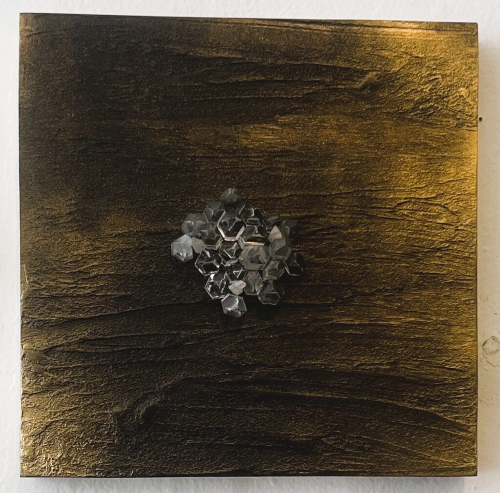 Wooden base with layers of acrylic followed by Crystals mounted in the center space. Mixed media, 12×12.