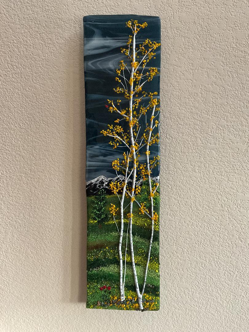tall wall hanging piece, fused glass, 8″ x 30″
