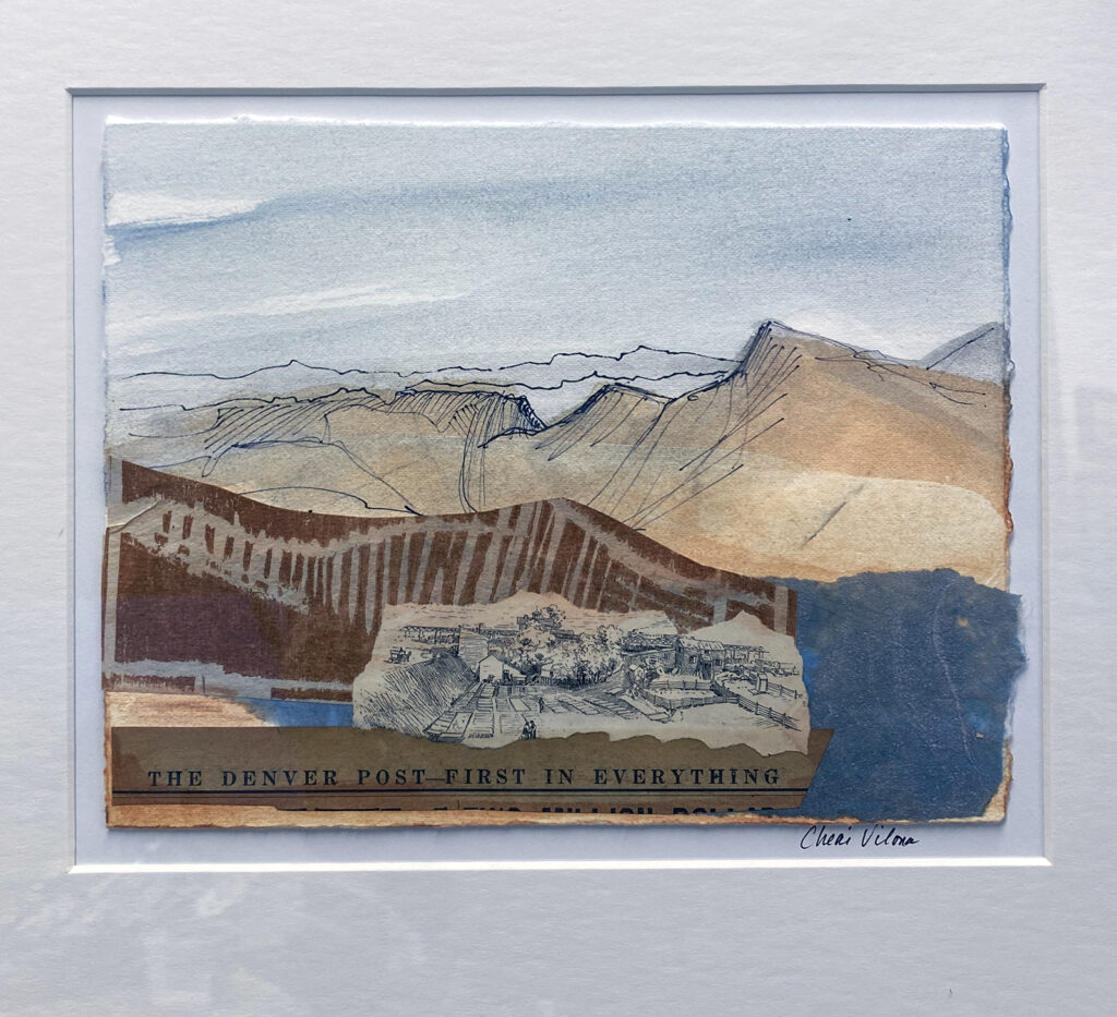 Mixed Media artwork, hand-water color, india ink sketch, hand-made paper, wood cut monoprint, antique journal sketch and antique Denver Post News C Frame is 16×18 with matteboard, artwork is on Arches Archival Water Color Paper.