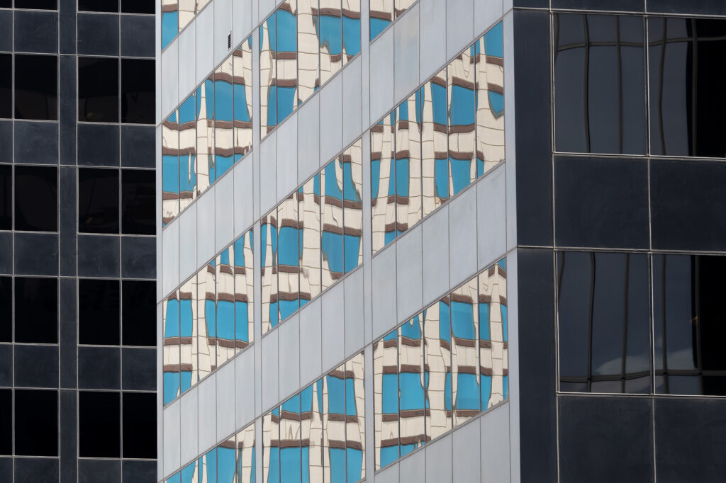 Walking through Downtown Denver recently I walked on a couple of streets which I had not been on recently. Keeping an eye out for something interesting in the buildings, I noticed this reflection in the distance. Having a little longer lens on my camera than I would normally use allowed me to see this new perspective. I think what drew me in for this photograph was the contrast between the light and dark while the colorful building being reflected eliminates the thought that this could be a black and white photograph. 30″x20″