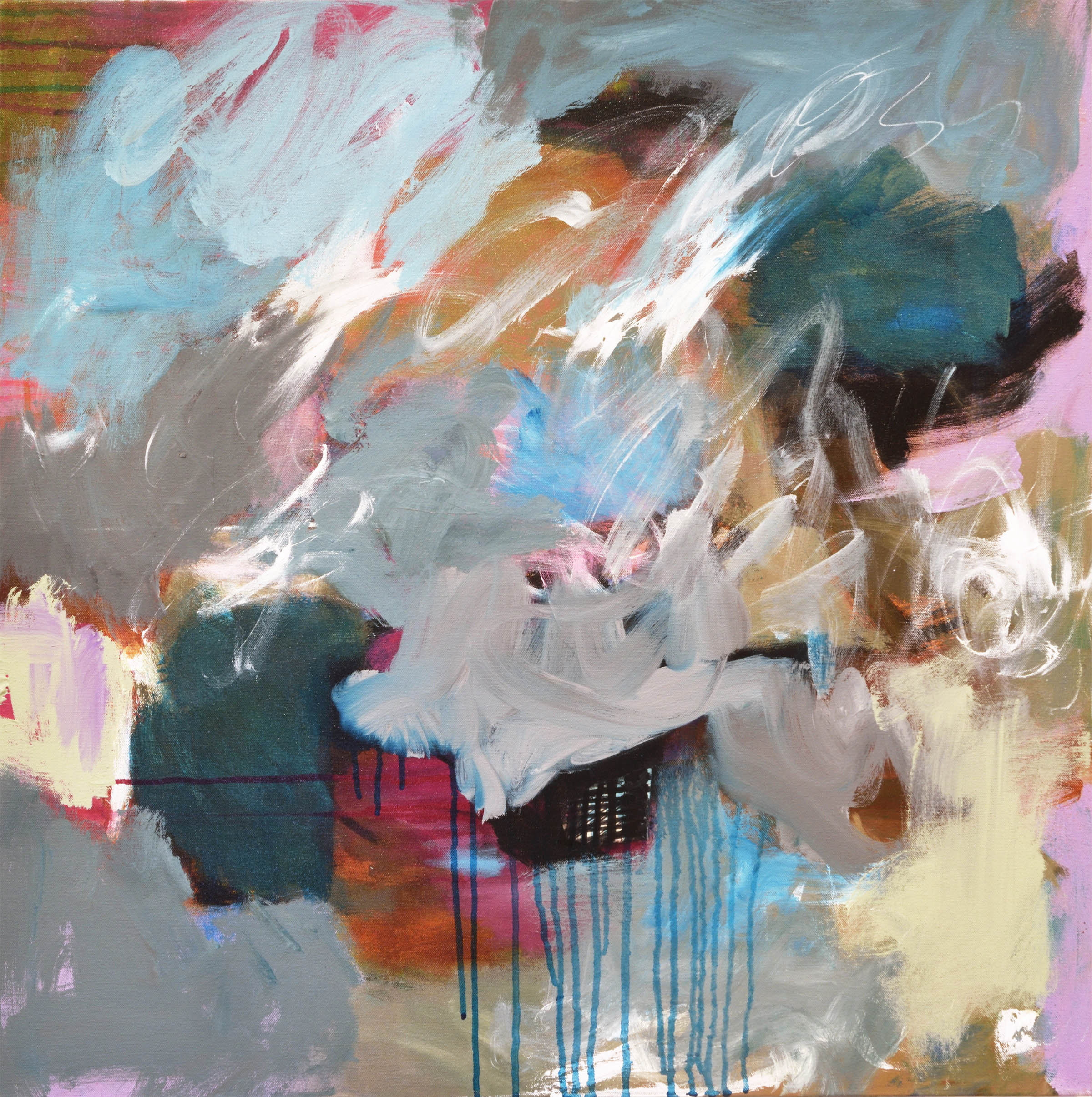 Inspired by the song, “Dream A Little Dream of Me”… “Stars shining bright above you, night breezes seem to whisper ‘I love you’, birds singin’ in the sycamore trees, dream a little dream of me.” Acrylic on canvas 31”w x 31”h x 2.25”d