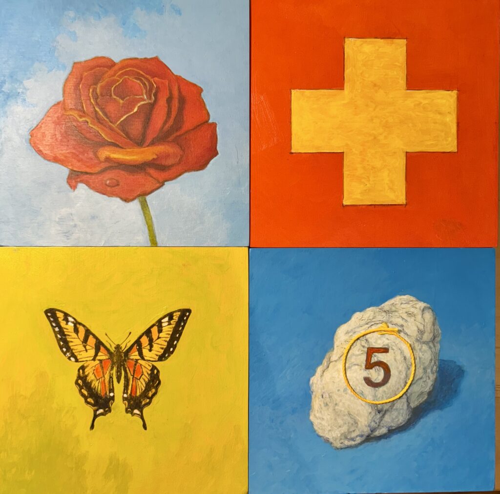 Painting on cradled board, Acrylic, transfer and string, 12.5 inches x 12.5 inches.