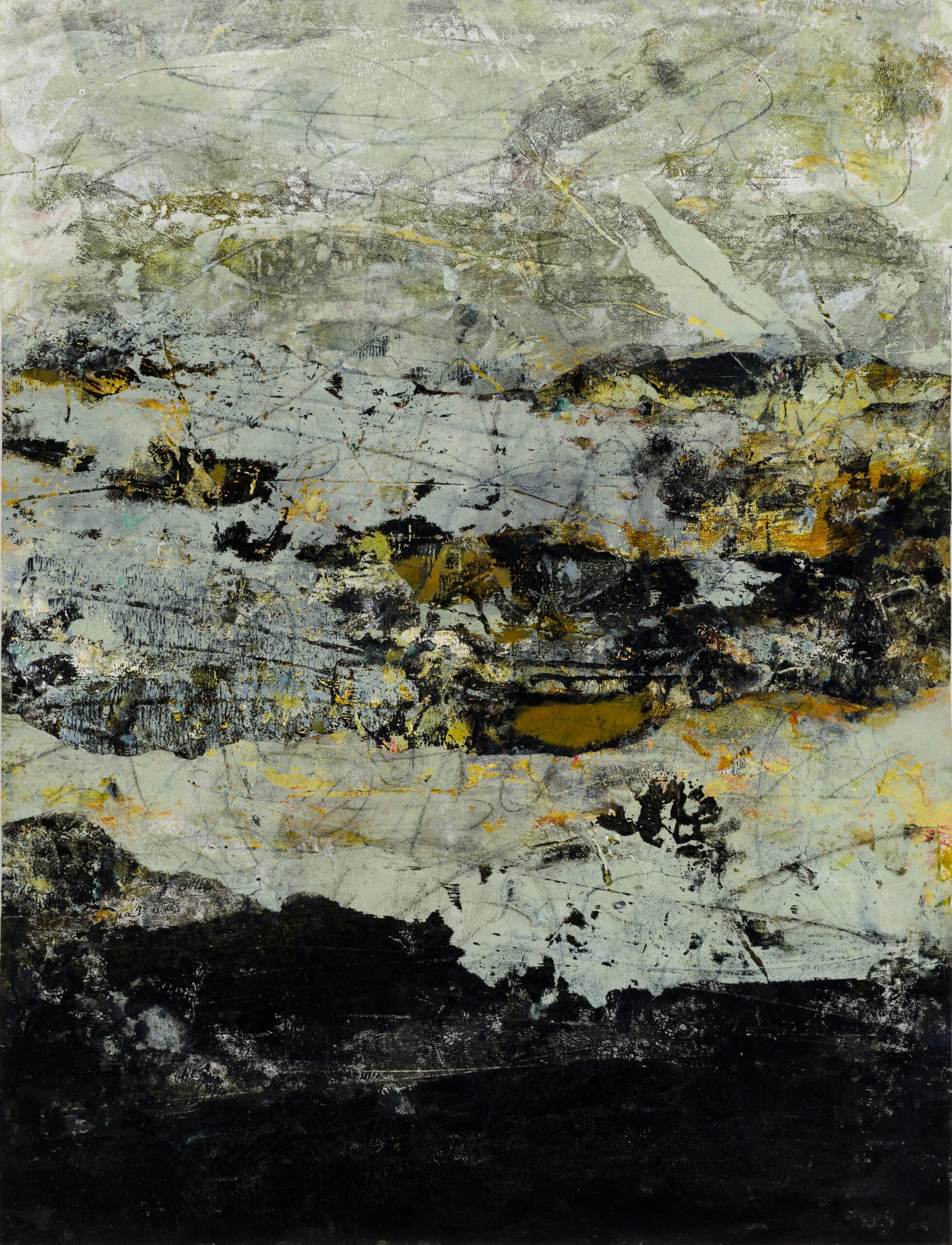 Black, pale green, off white, yellow, gestural graphite marks, abstracted landscape on wood panel, acrylic paint, dragon cloud rice paper, graphite 23″ x 17.50