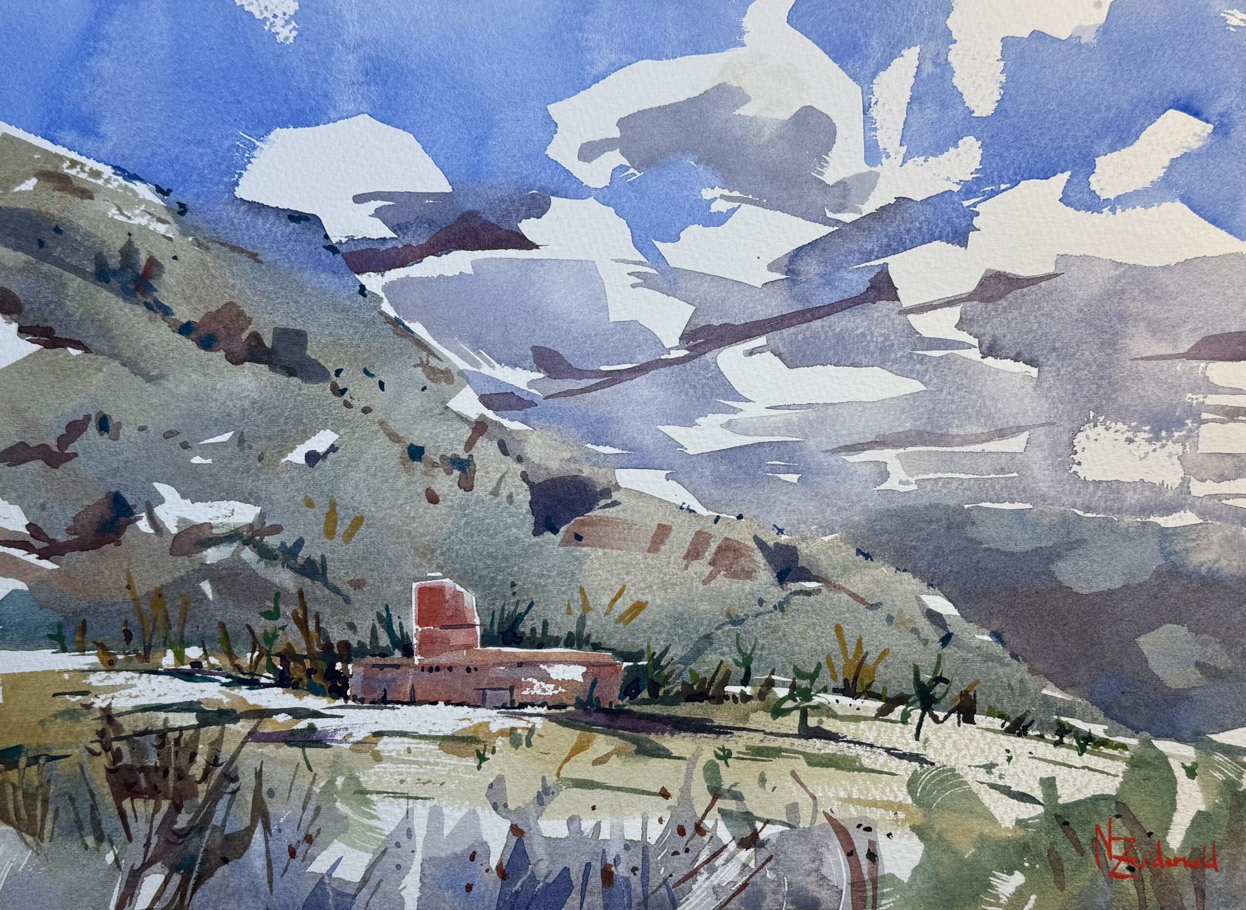 A loose representation of an adobe house set against the desert landscape, contrasting geometric and organic elements. Watercolor, 16″x20″