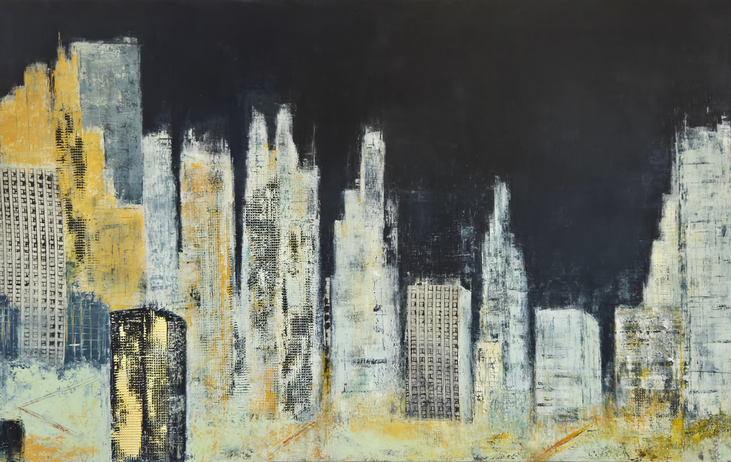 Painting of urban landscape, mixed media (oil and cold wax with encaustic monotype collage), 23 x 37″