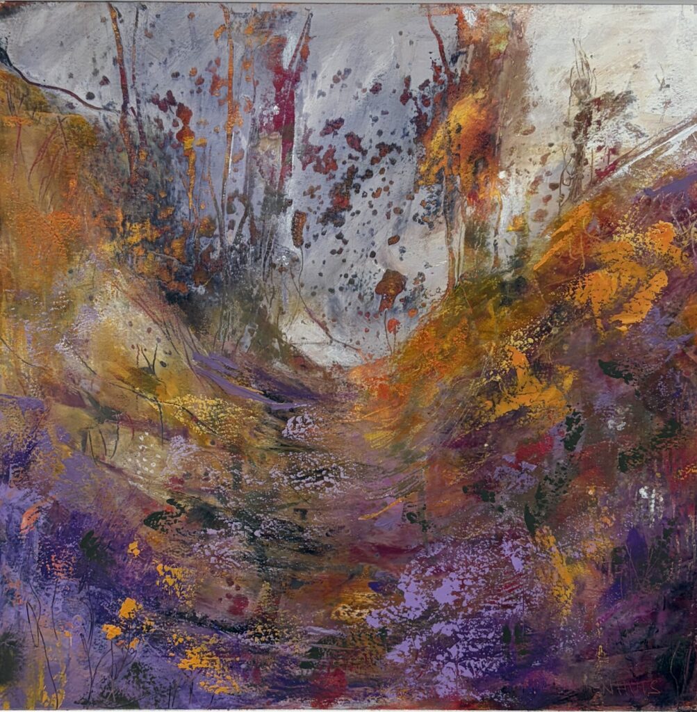 Under the paint this piece says “building my ladder to the stars” – a richly colored and textured painting. Oil and Cold Wax on Arches Oil paper in a custom solid oak frame, 18″ x 18″.