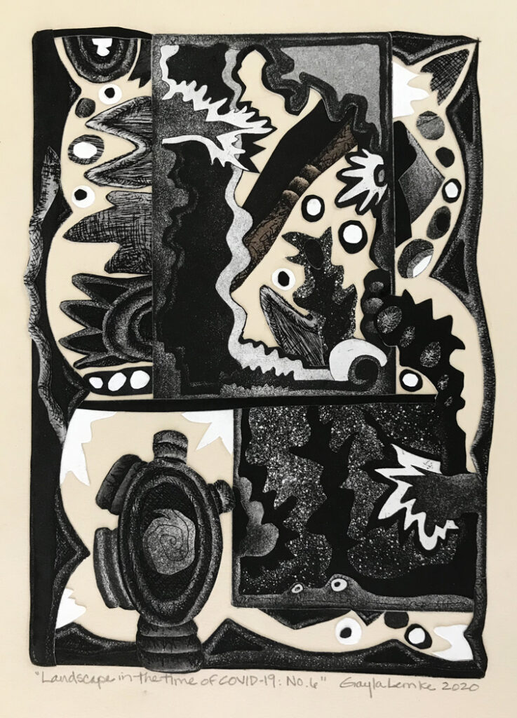 This piece was created by collaging cut up parts from previously made intaglio prints. The prints were from zinc plate etchings and included proofs and prints from various stages in the process of working on the plates. Collaged Intaglio Prints, 17 1/4″ X 13 1/2″.