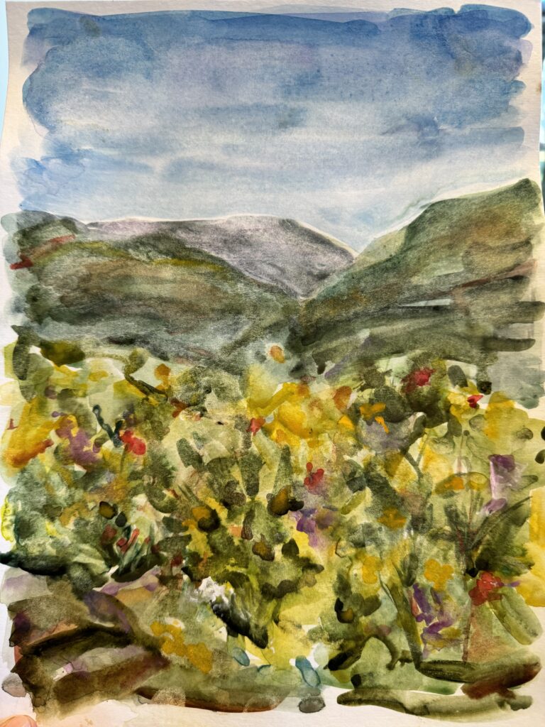 Watercolor and gouache, 12×15, This is a scenic fall view from a hiking trail along the Lehigh Valley Horge In Pennsylvania.