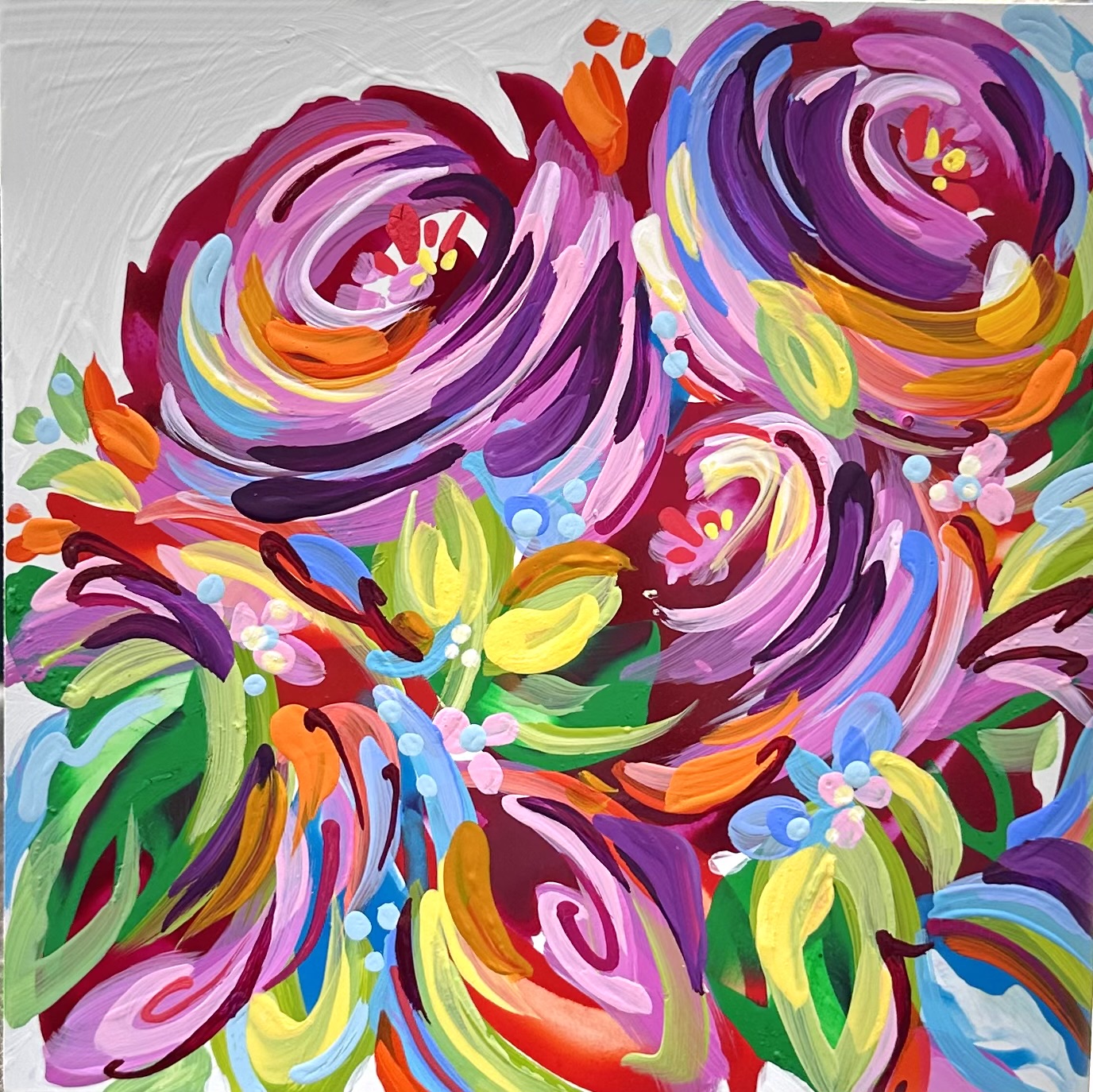 Brightly painted floral in purples, fuschias, oranges, and greens reminiscent of summers’ gardens, Acrylic & Ink on Wood Panel 8″x8″x2″
