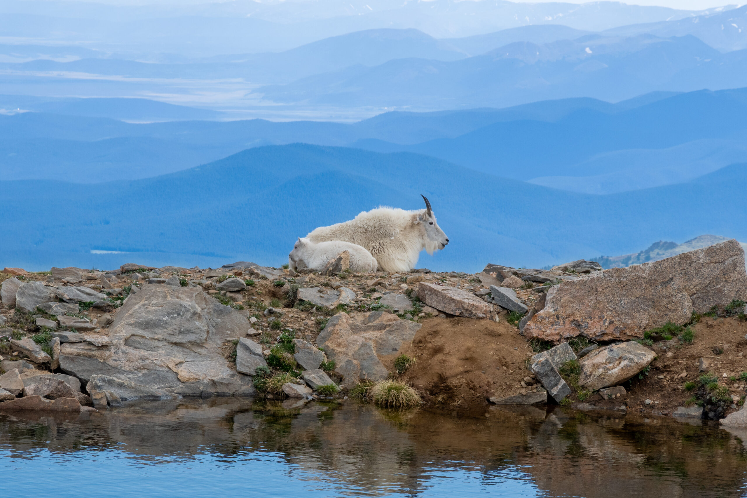 Resting high on Mount Blue Sky, a mother mountain goat and her kid overlook the magnificent Colorado Rockies. Photography on Metal, 16″ x 24″.