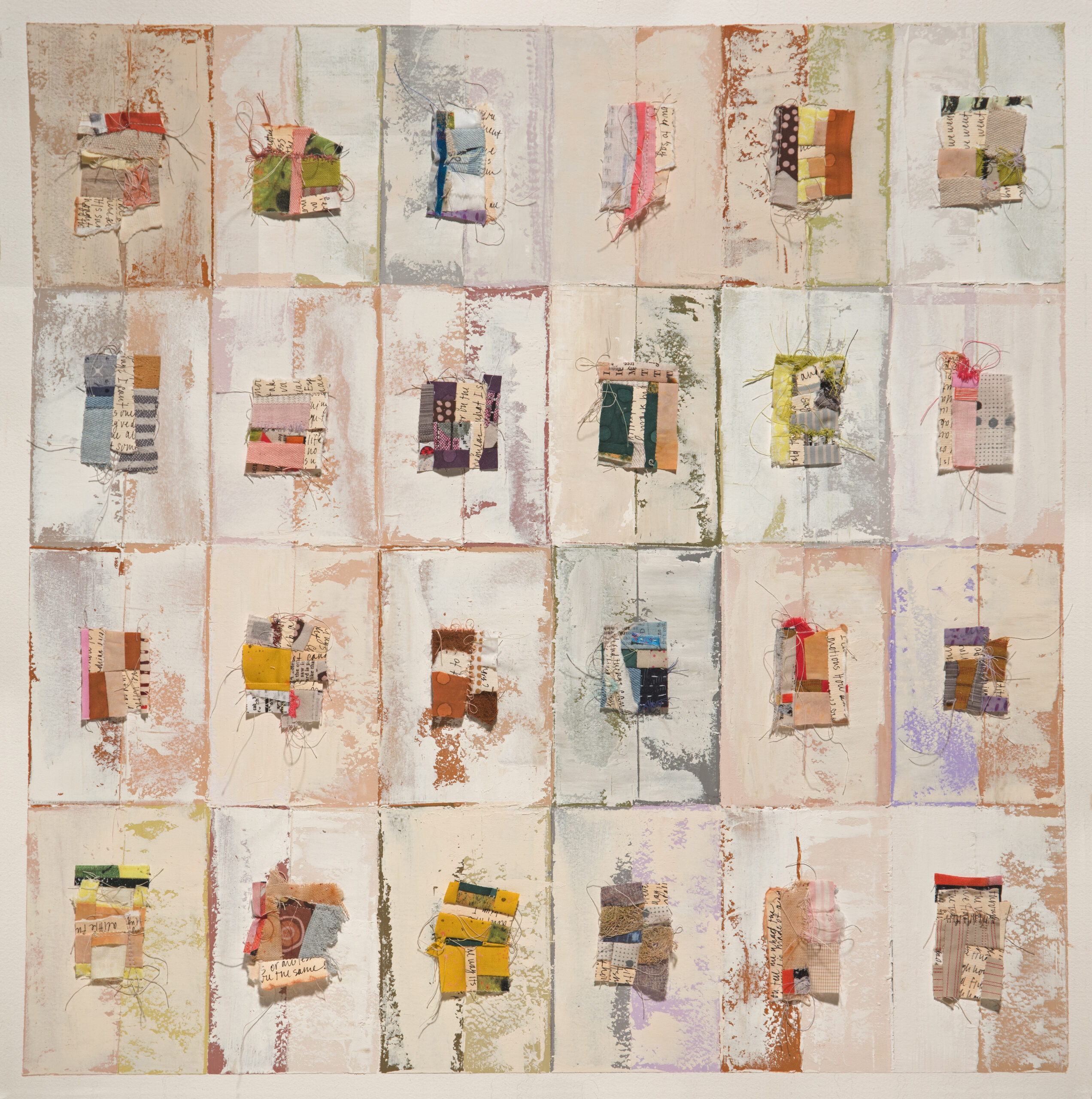 Quiet Conversations is made from stitched paper and textile fragments that are layered, cut, and resewn into small, quilt-like constructions. Rather than paper and pencil, these compositions reflect the way I draw — intuitive responses to a theme or feeling, made with found objects and meaningful scraps from everyday life. I work on them throughout the day and often carry them in my pockets, allowing them to be weathered by and reflective of the time in which they are made. Each piece is meant to hold its own place while also contributing to something larger than itself, much like being human. Oil and cold wax with mixed media sewn constructions, 28 1/8 x 28 1/8″.