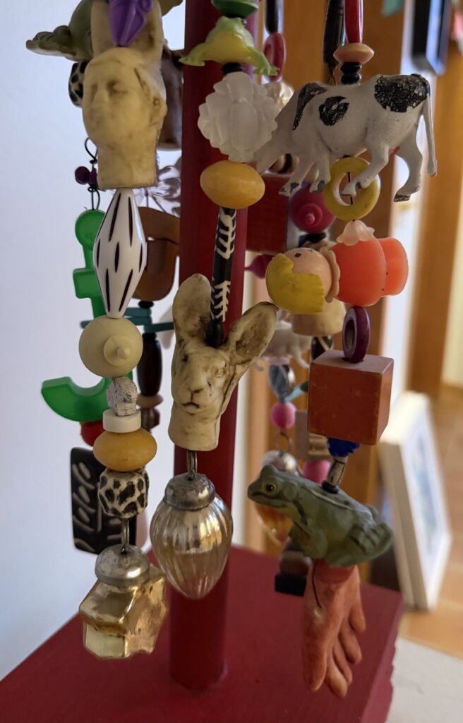 This mixed media sculpture has a clay form, a bodice fashioned to duplicate an actual blouse I wore when I was little. The drape was to gun to make. I used toys, faces and hands made from molds, and lots of found objects. Some of the objects I had collected for years and dome were random. As I assembled the objects on the strands I worked with the strands in an aesthetic nature- each strand had to work in the overall collection to succeed in my expectation to convey joy and “freedom” (doing what I wanted during recess!). Clay, paint, buttons, wooden pole and base, many objects and toys, 33”L, 6.5”depth, 9”w.