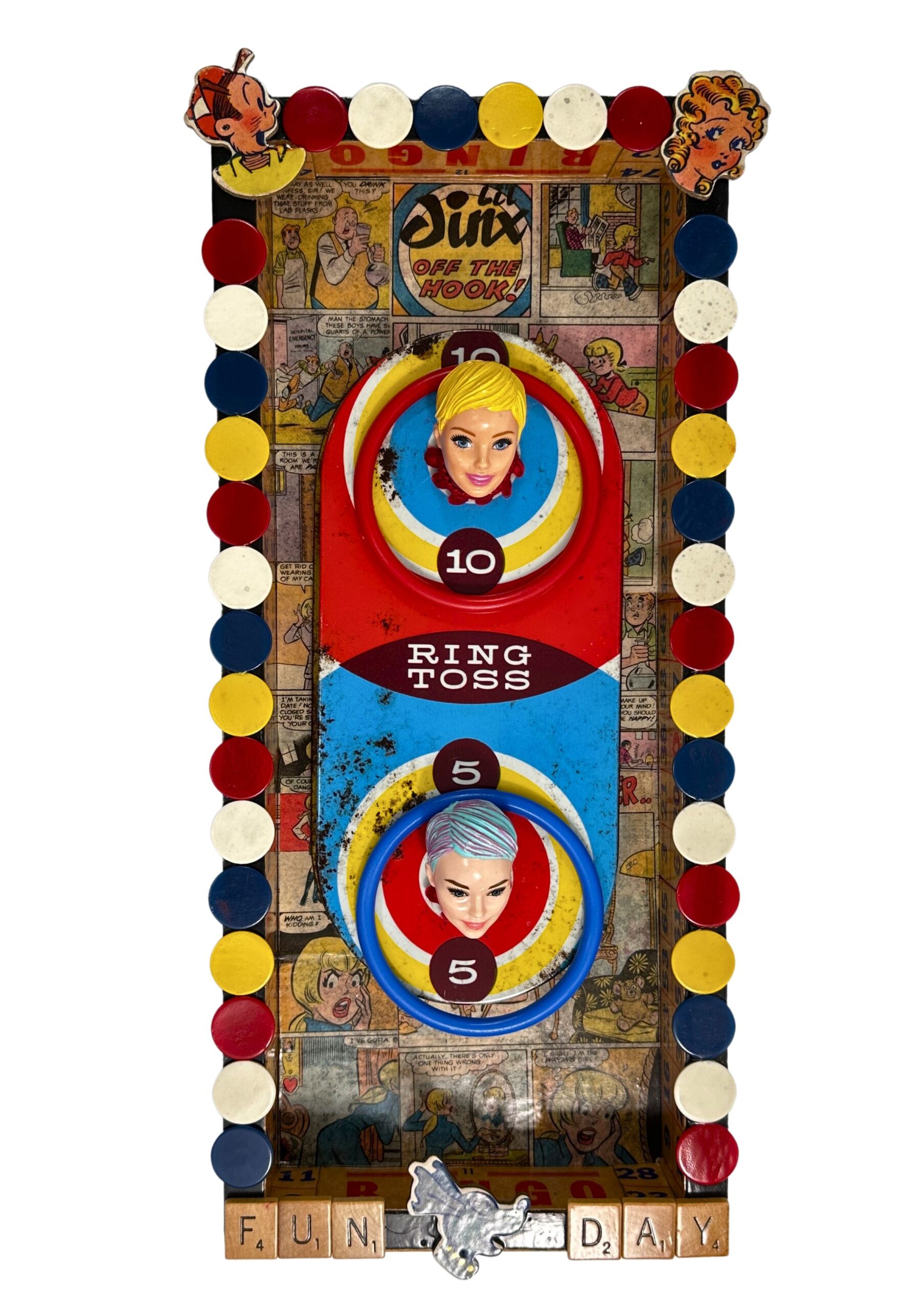 Mixed Media, 17″ x 8″ x 2″, Step right up and take your shot! Ring Toss is a playful tribute to those lively carnival days when winning felt just out of reach but the fun was always worth the try. The vibrant red, blue, and yellow beckon you back to the midway, where laughter and the clang of games filled the air. With doll heads peeking mischievously from their targets and rings just waiting to land, it’s a game of whimsy and determination. The comic book decoupage and “Blondie” puzzle pieces add a dash of vintage charm, reminding us of simpler times. This piece isn’t just about nostalgia—it’s a celebration of fun, challenge, and the joy of trying again. INGREDIENTS Vintage metal Ring Toss game piece, vintage comics, Blondie puzzle pieces and game pieces all in-cased and preserved in several layers of resin.