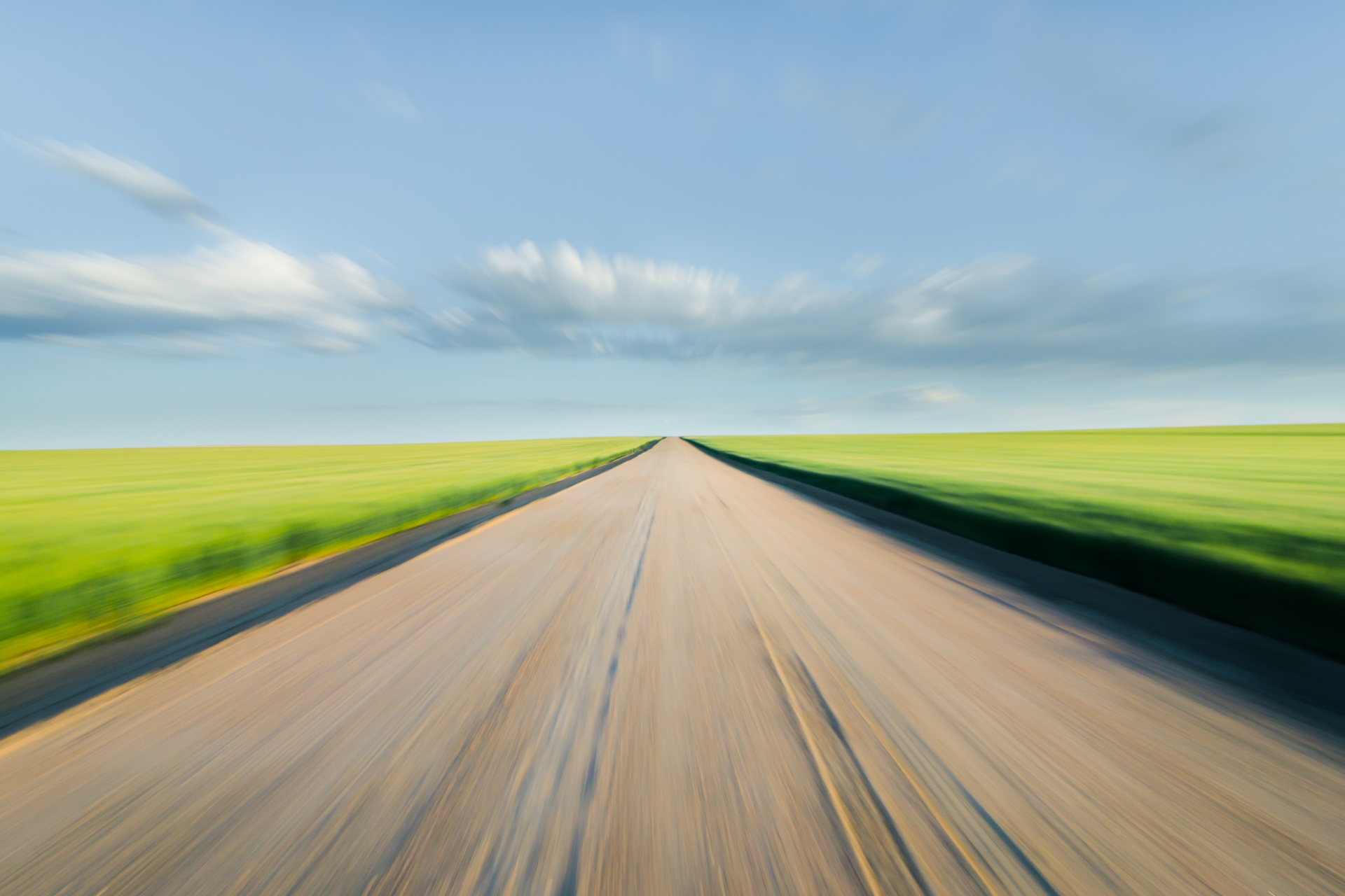 Photography, Archival pigment print on cotton paper, 17 x 25. Road Rush creates a feeling of motion with a quick twist of a zoom lens during exposure, the positive effect of boredom during an otherwise quiet day of photography in eastern Colorado.