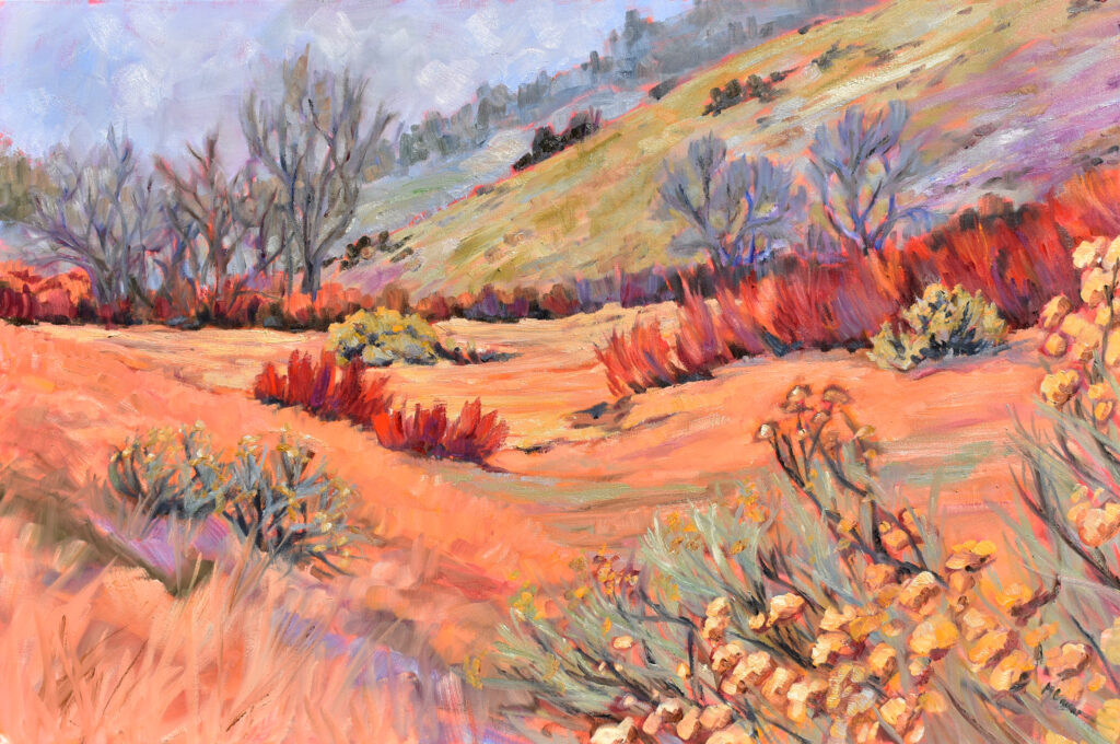 A gentle glimpse into the transitional season in beautiful Bear Creek Lake Park. Oil, 32″x44″.