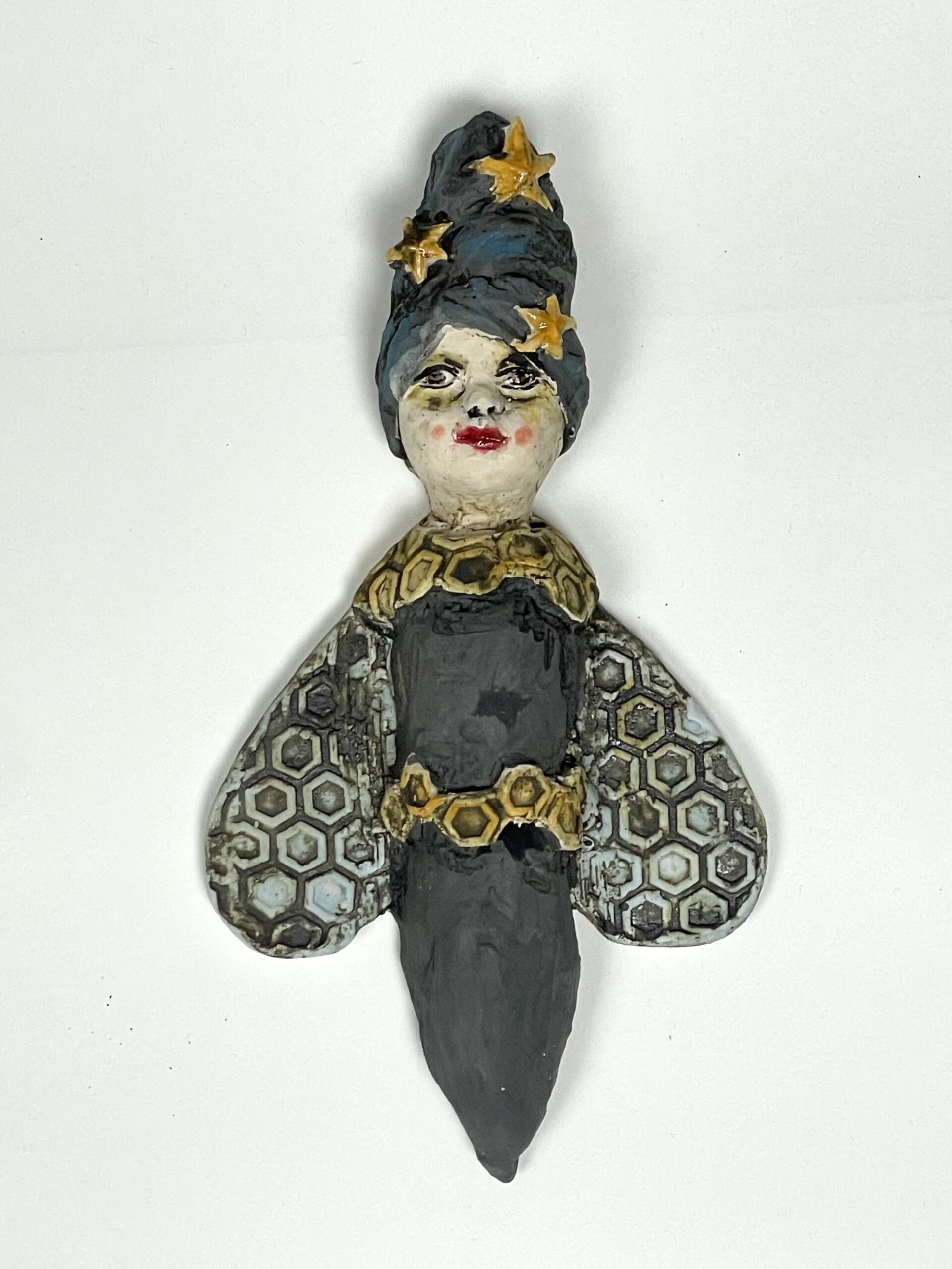 Handbuilt ceramic queen bee with stars, 10 x 5 x 2 in
