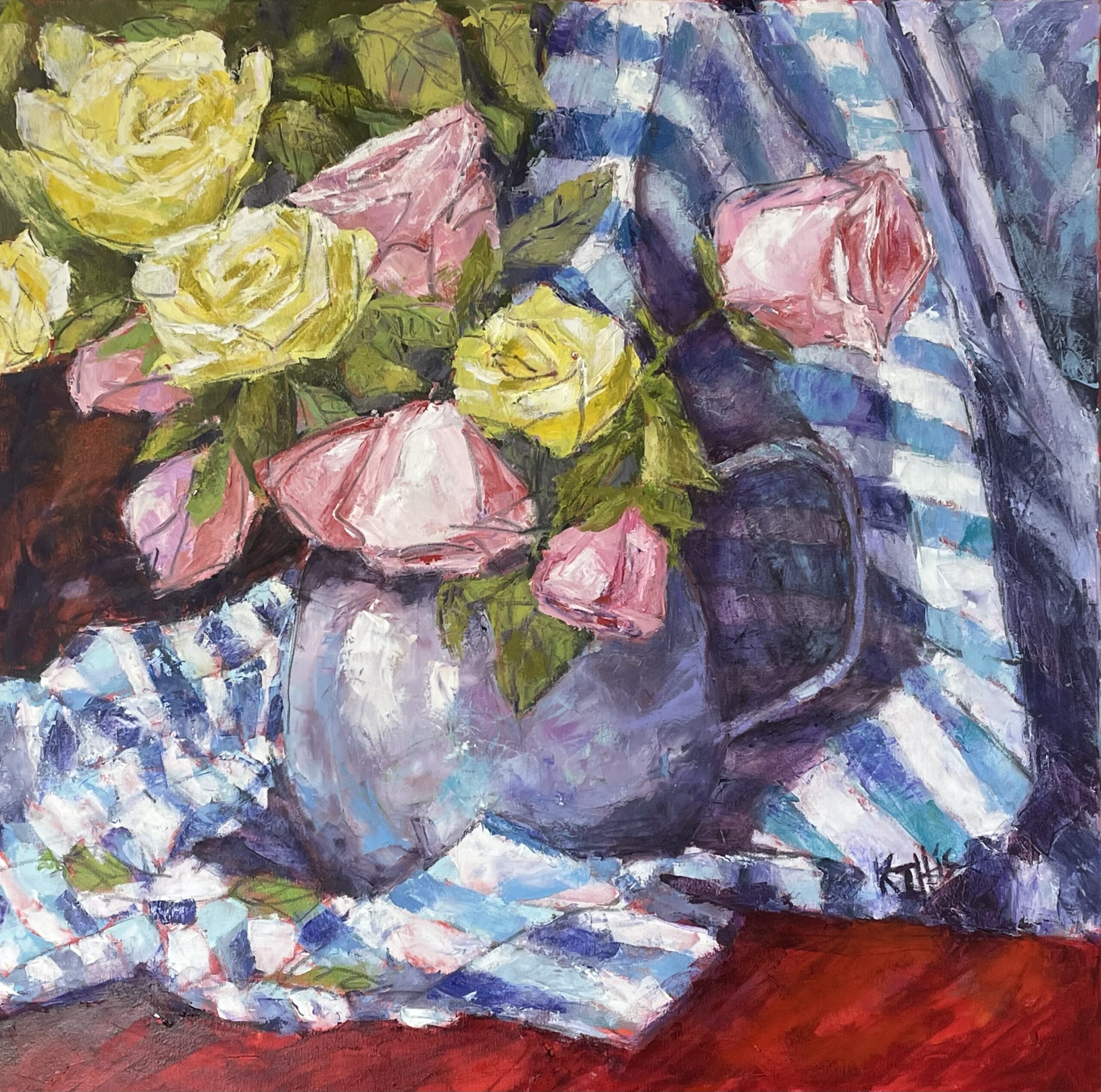 Yellow and pink roses set in front of blue and white striped cloth on red foreground. Oil, 36″ X 36″
