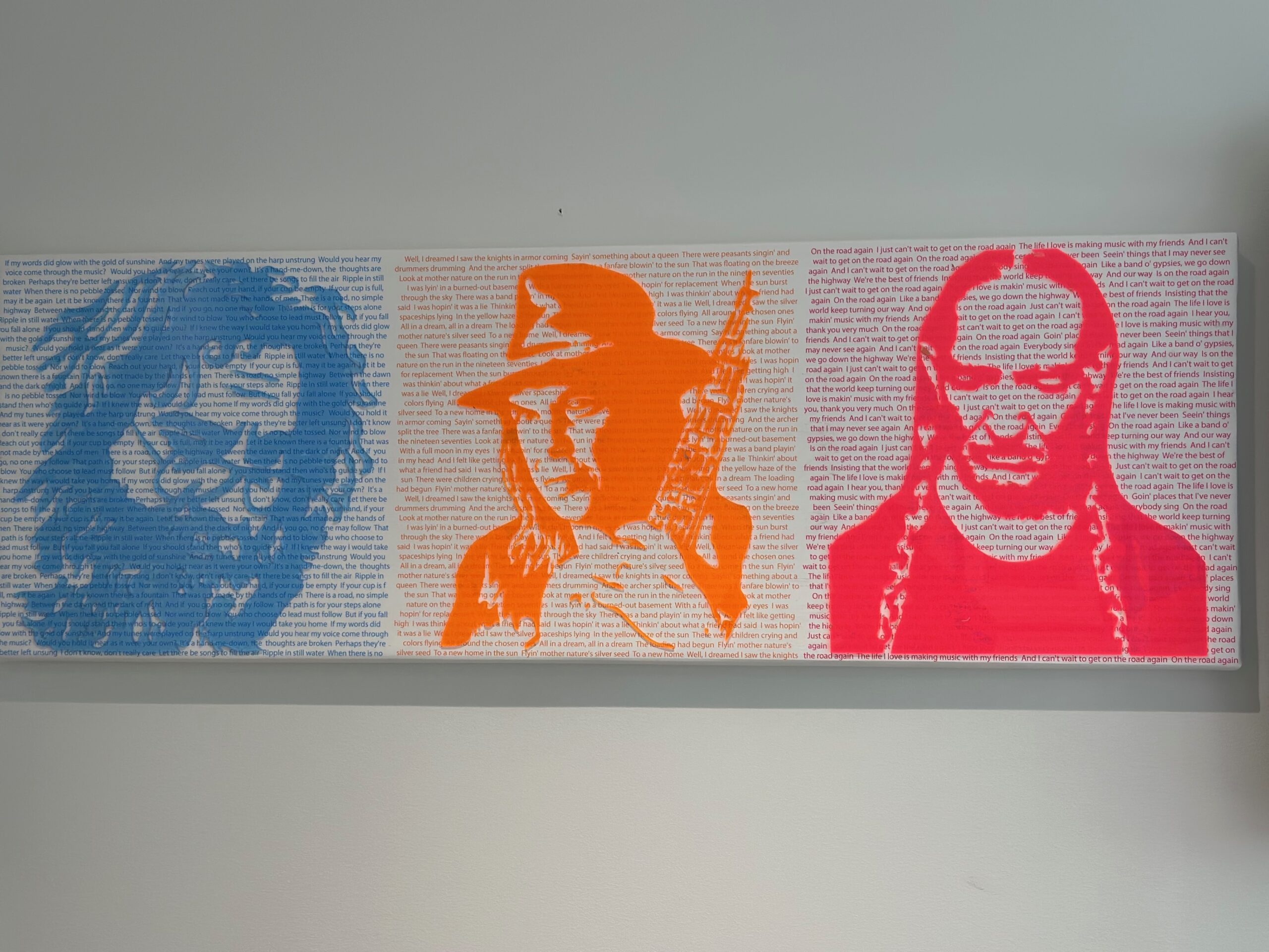 This mixed media artwork is created from Sheets of 1/8th inch acrylic and paper. It represents three men who have impacted the world in a positive way and who make me smile. Mixed Medium, 49.5 x 16.75.