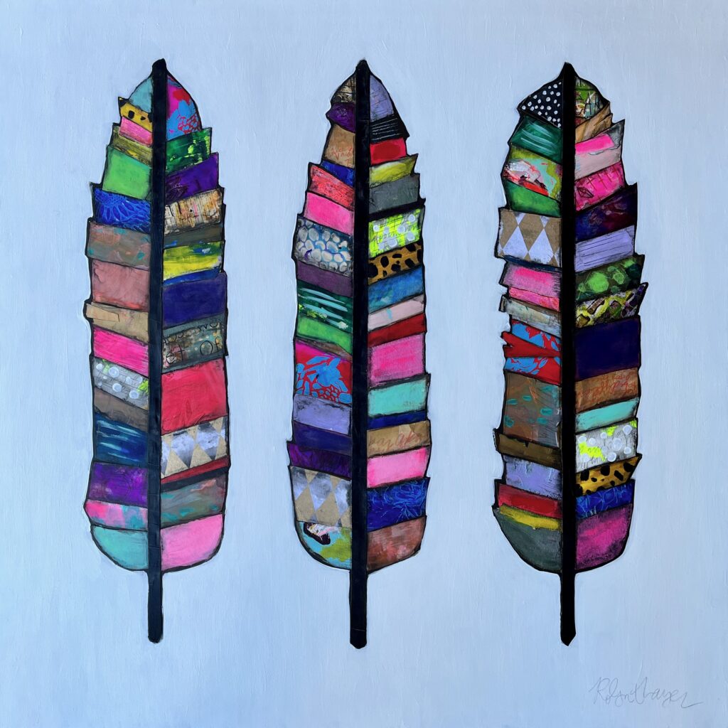 Three collaged feathers made from cuttings of artist’s paintings, white background, on wooden panel. Acrylic Collage, 36×36 inches.