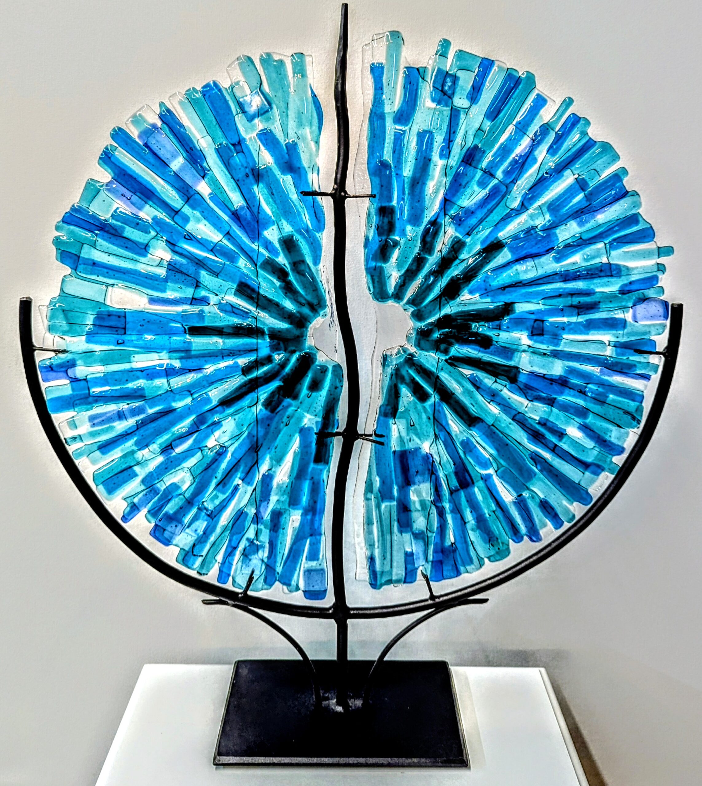 One of a kind fused glass panel. Layers of complementary blue hand cut glass fused together to create a two part decorative sculptural tabletop piece. Glass, 21w x24 high x5 deep