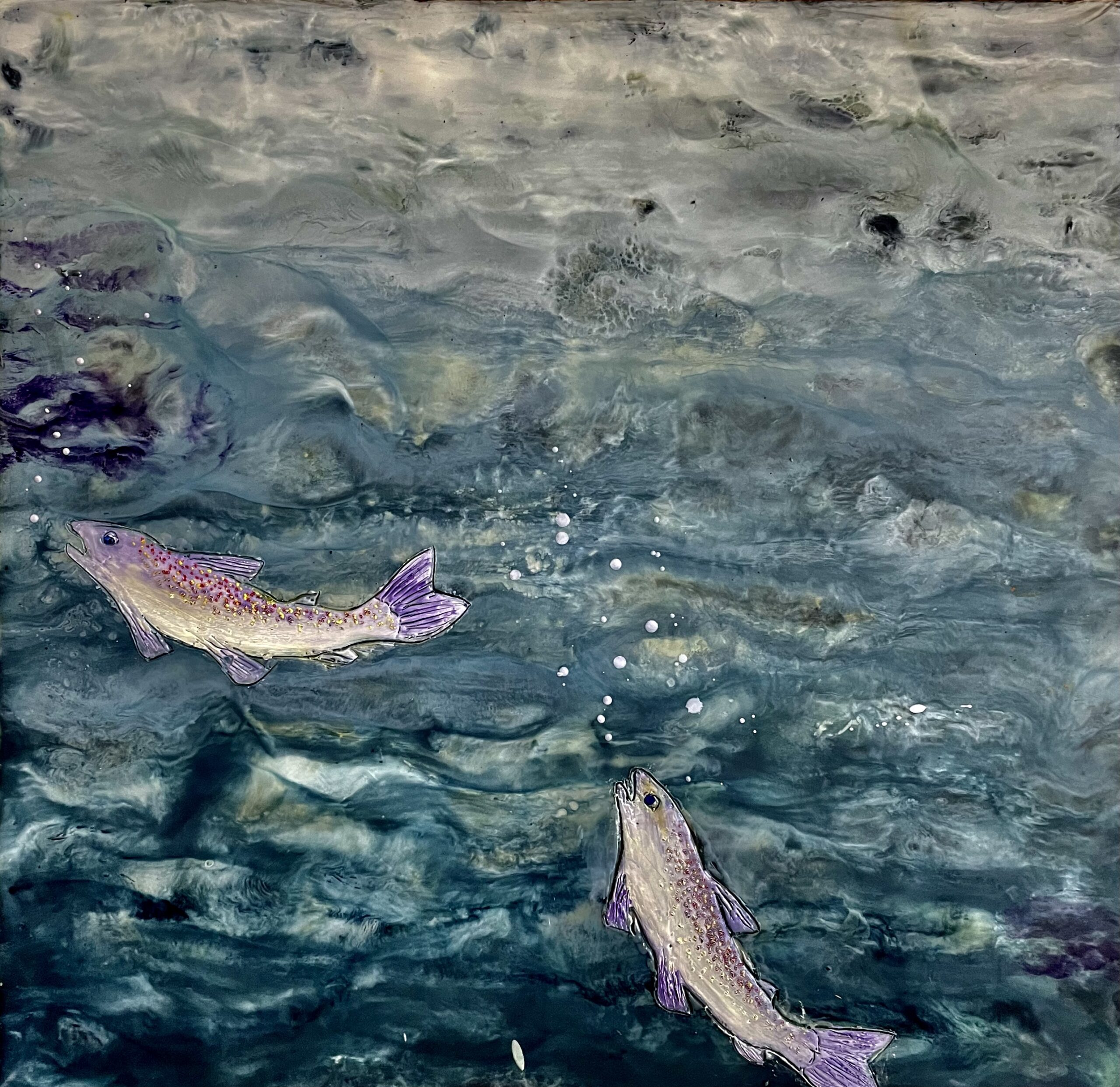 Encaustic on Board, 24″ x 24″, Two carved trout on a water background.