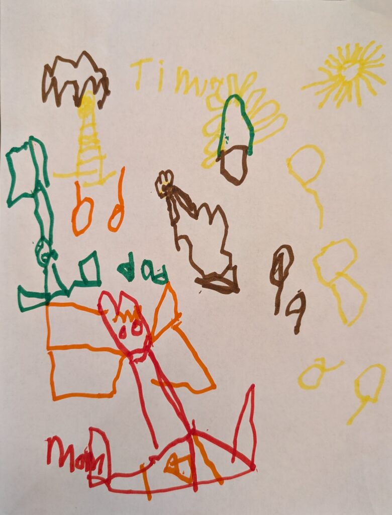 He drew his sister in the yellow and brown in the top left (and wrote her name Timley in yellow), his dad is represented in green (and he wrote dad next to it). He drew me with a red heart face and said that I am lifting weights. He also drew a tree, a brown flower in the center, and the sun. The other shapes that look like b and d are leaves.